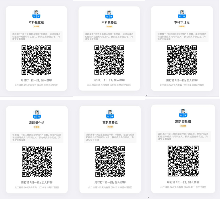注意事项:如需预订浙江金融职业技术学院校内浙江金苑宾馆(双床标间含早餐,280元/间)的参赛团队,请务必于11月17日周一前扫描二维码填写钉钉预订信息收集表。若浙江金苑宾馆无法满足所有报名团队的住宿需求,工作组将按照报名预订的先后顺序进行协助预订。对于超出浙江金苑宾馆容纳能力的报名团队,我们将帮助联系并推荐就近的宾馆。